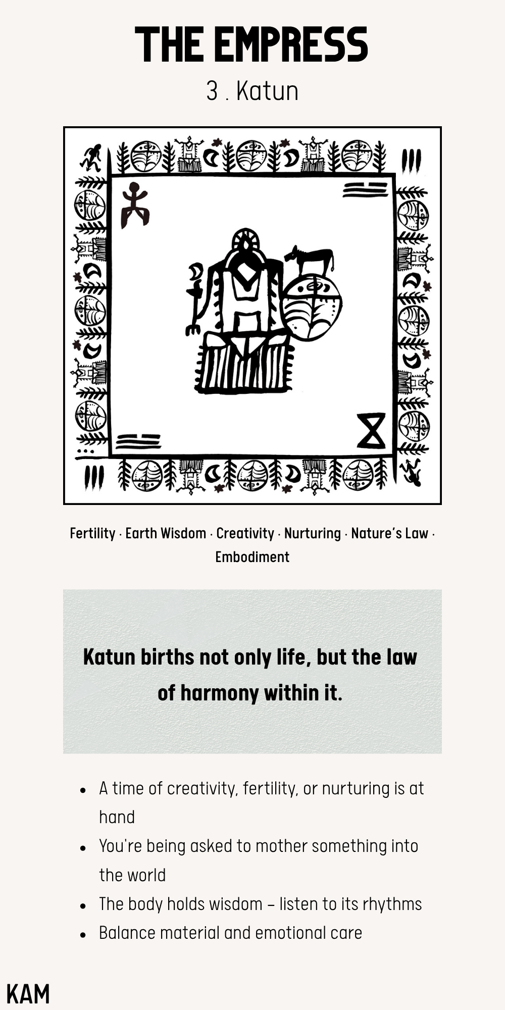 3 – Katun (The Empress) is the third card in the Kam Tarot deck. Inspired by the archetype of the Empress, Katun is the life-giver — a symbol of fertility, sensual presence, and the nourishing rhythms of the Earth. In Turkic cosmology, the Katun is the powerful feminine ruler, a maternal figure who embodies both softness and sovereignty.