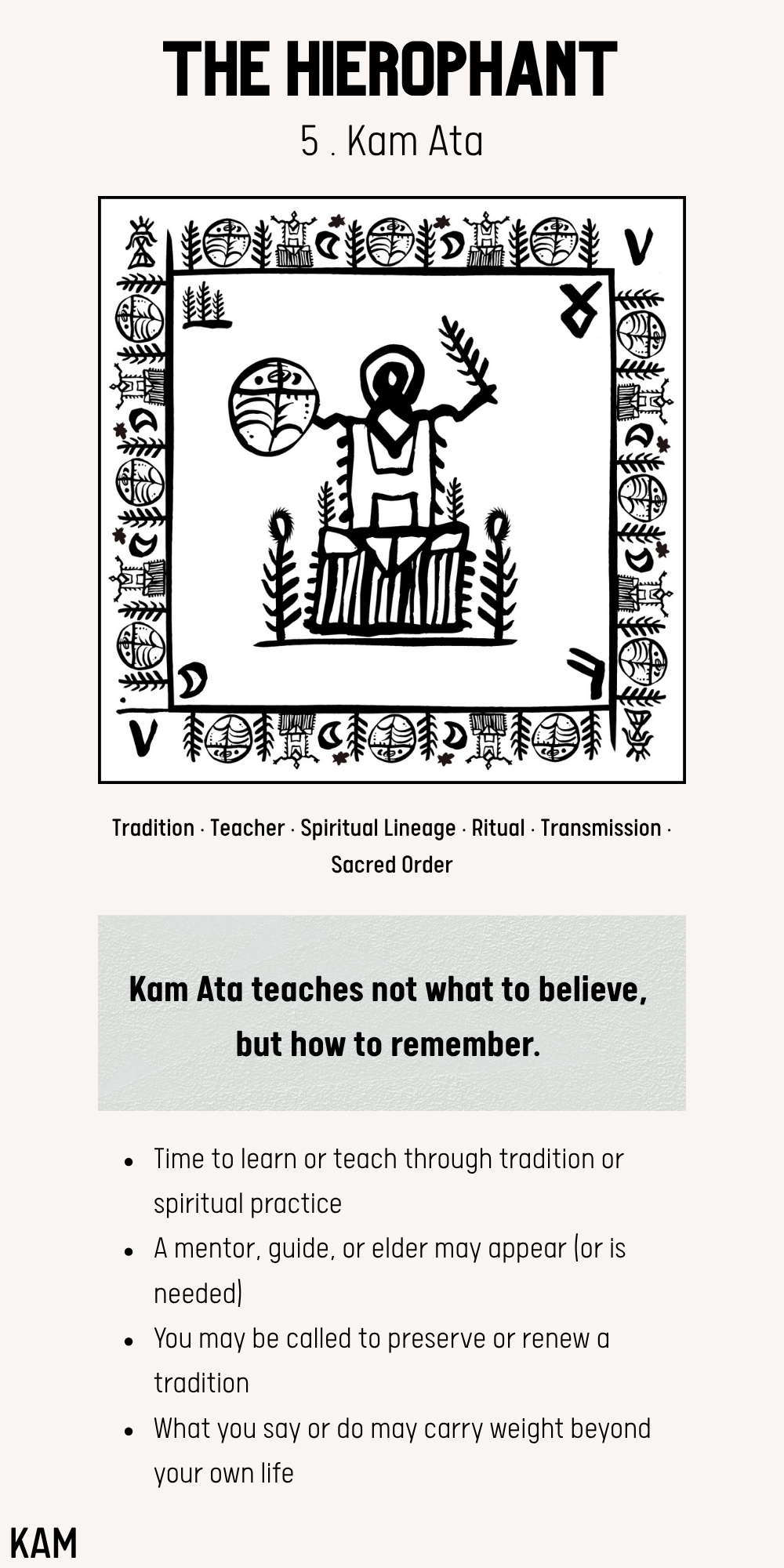 Kam 5 – The Hierophant represents sacred knowledge, ancestral codes, and spiritual responsibility. He is the keeper of the tradition — not to repeat it, but to renew its meaning.